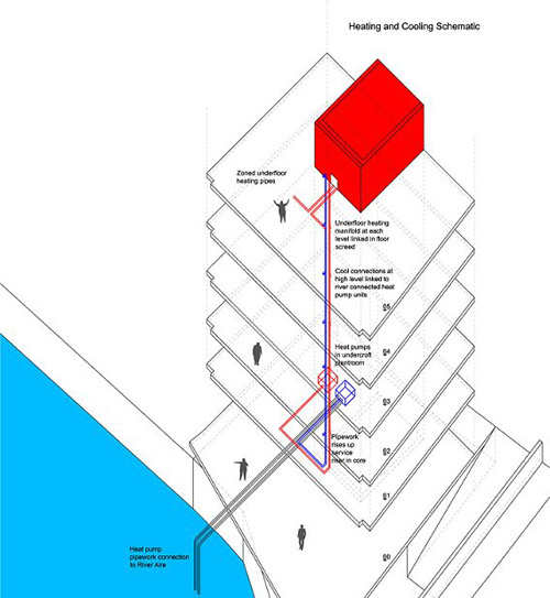 室内有一个很大的玻璃箱子结构,以此容纳各种功能需求。它围合了一层层的地板,而没有影响外表皮的形式。最后,建筑的物理系统和海水有关联,水管位于海水中,利用海水,通过热交换器、泵,提供一个可持续的加热和冷却系统。