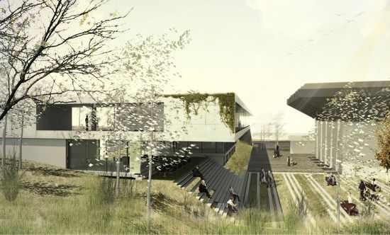 此外,设计师没有在校园里建造新的通道,现存主要的通道区域通过绿色景观得到丰富,按照地势特点改造成休息区。这些建筑不会对校园内的绿色区域造成影响。相反,它通过楼梯和开放空间丰富了绿化面积。