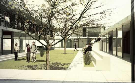 该设计的主要理念是在建筑环境和景观设计之间创造协调的条件。内部空间和外部空间在历史性建筑之间通过开放、半开放和透明的表面设计得到相互交流。