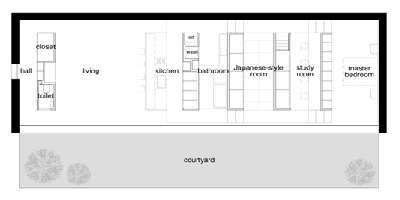 这所房子本质上是一个结构单一的“大房”,但室内的家具(木制品)却很齐全。房子位于日本广岛郊区。那里到处都是低层住宅。Warehouse的空间尺寸为长21..5米×宽8米×高3米,其中一面墙壁完全由磨砂玻璃代替,结构非常单一。这个“一室空间”的内部由大厅、客厅/饭厅、厨房、浴室、日式房、书房以及一间主卧室组合而成,呈直线排开。通过楼板平面的变化以及功能家具的布置,这种“一室空间”结构被分割成若该条块空间。