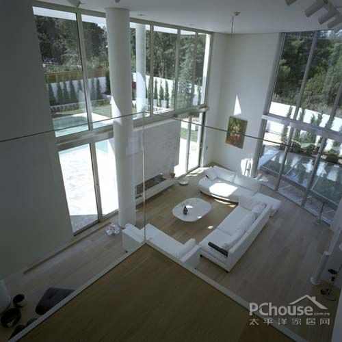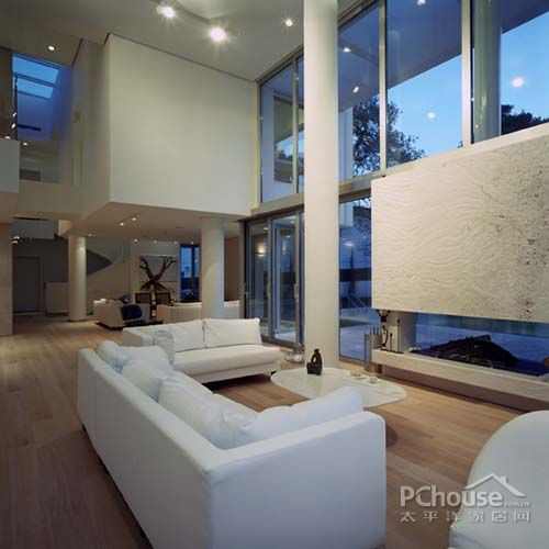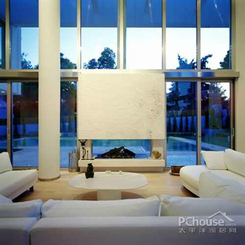 最令人印象深刻的地方是那个阔大的客厅,里面配有一套十分气派的壁炉。壁炉是室内与室外的交接处,尺寸大得好像一面墙。此外,两层高的的客厅显得格外宽敞,四周还安装了大型落地玻璃,这种设计不仅可以充分享受日光的洗礼,还能随时随地透过玻璃门观赏到美丽的花园和碧蓝的水池。
