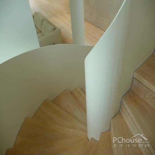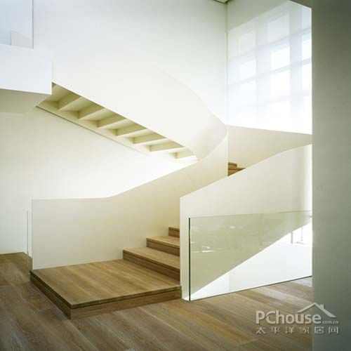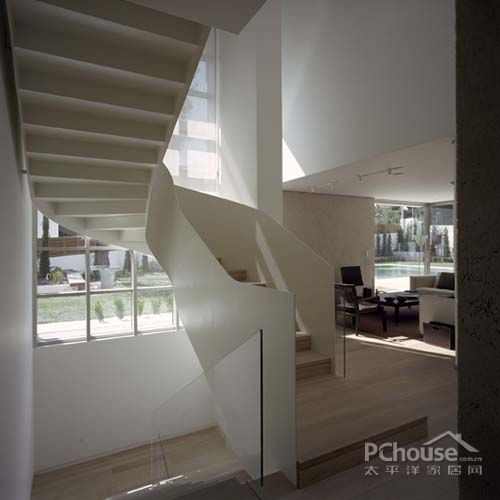 直线和直角形的空间构造贯穿整个住宅,其中穿插了一个微弧的楼梯。该楼梯通往楼上的卧室。