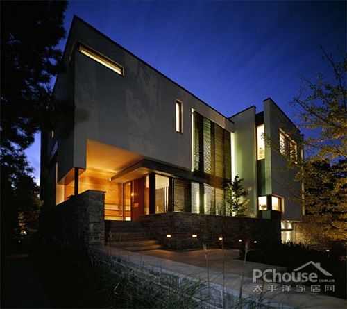 别墅占地7,300平方英尺(680平米),坐落在多伦多的一个环境优美的自然保护区内。屋主希望我们设计出一栋开放式的现代住宅,以便观赏到屋外的美丽风光。由于我们利用了暖色调的毛石作为基础,因此整栋建筑好像原本就属于当地风景区的一部分似的。在外观上,我们刷上了浅色灰泥,特意设计了几个转角,好让阳光能够进入室内。外面的红木屏风和玻璃装置可以挡住路人的视线,这样就充分保护了室内的隐私。到了晚上,屏风上的照明装置就会发光。
