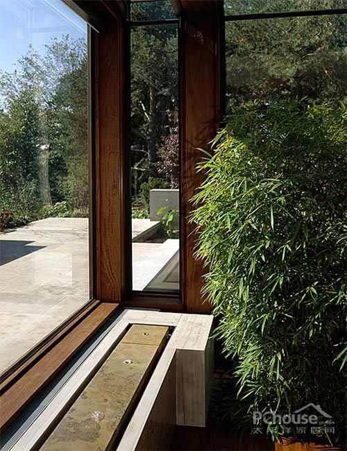 室内布局颇合理,有两间位于不同楼层的餐厅。设计师充分利用保护区的风景优势,专门安装了落地玻璃门,并连接着抛光地板一直延伸到房子后面。由于玻璃门的缘故,客厅和餐厅内能够向外展现。厨房面积很大,空间还延展到玻璃温室那边去。温室里种着许多花花草草。颇有意思的是,室内有个喷泉,在阳台上可以看到它。