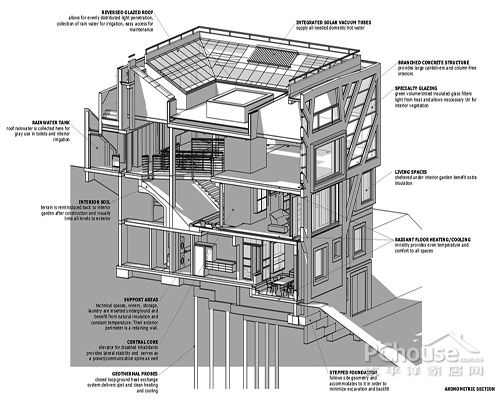 子块和系统也在运作,与自然原型保持一致:玻璃幕墙和太阳能板利用太阳能工作;翻转的屋顶通过输送雨水来灌溉草坪;粗糙的多层面板有绝缘和防潮的功能;多功能垂直模芯负责通讯和公共设备方面的运行。