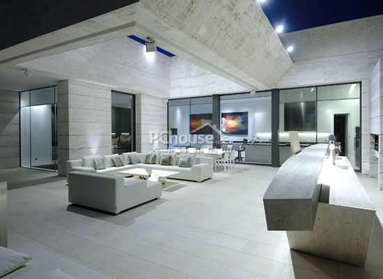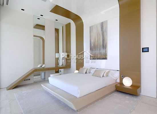 这个楼层的对面是主人的卧室。它的主色包括白色和金色,有一个超大的窗户。这间房还包括衣帽间和大浴室。沿着室内楼梯走下去,就是地下室。那里有三间卧室,各自都有一间浴室和游戏室。另外,地下层还有健身房、放映室、酒库、工具房和车库。家具设施都是由A-cero采用优质材料设计而成的。