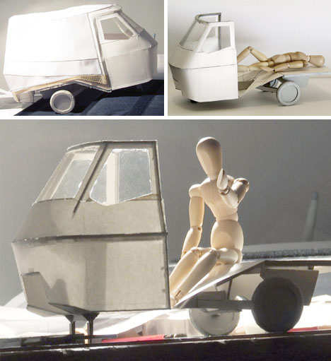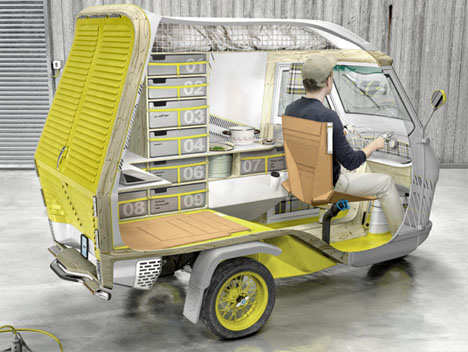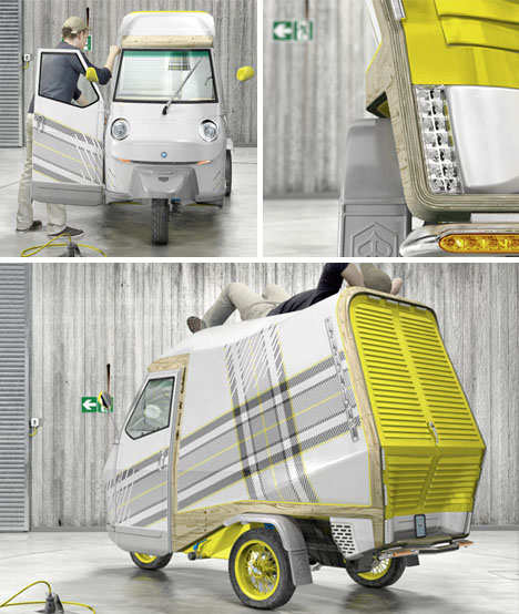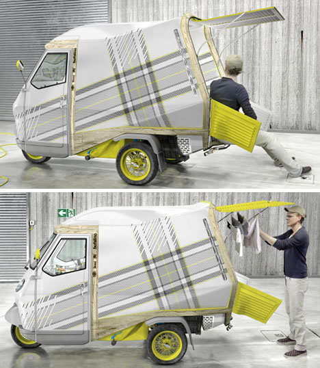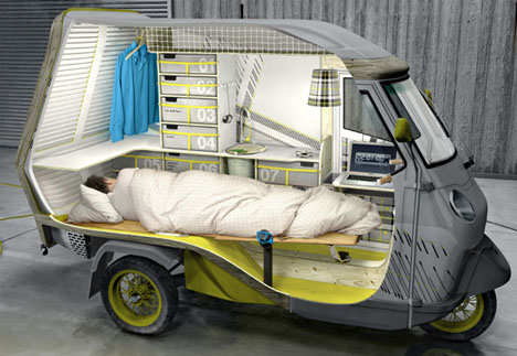 该作品取材于早已流行开来的小型三轮汽车(比亚乔牌)可能是世界上最小的便携式住宅,兼具汽车、露营、拖车及帐篷等功能。最棒的是,它还可以容纳生活必需品,并且加以创新。可以说,这款迷你车让人省了不少心。