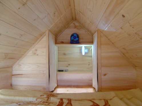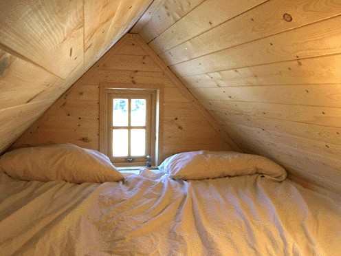 卧室,是在阁楼。xs - House是我们所有的房子最小的卧室。但是它足够大,相当于一张大号床,当然如果说,这卧室如果是2个人住的还是一点点小。床垫是泡沫(或类似),以便它可以被卷起,这样方便阁楼上下。阁楼最高高度约1米。