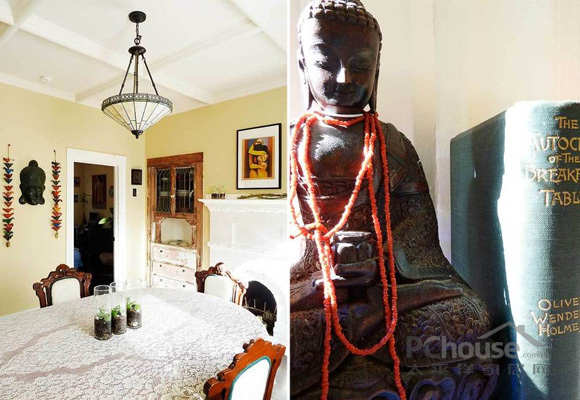 整个墙面被刷上了深石灰,柿子,蜂蜜等鲜亮的色彩。剧院的古董桌椅和蓝色的椅子罩布;深红珠悬垂围绕一个盘腿佛这一切都让空间充满活力。算是一个完美的复杂组合。