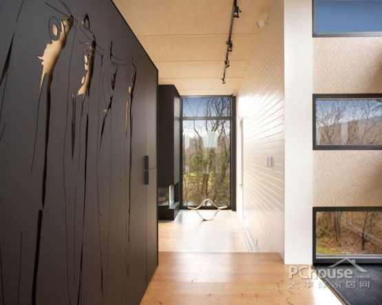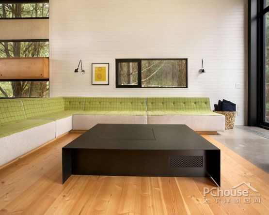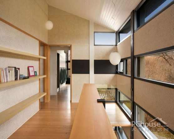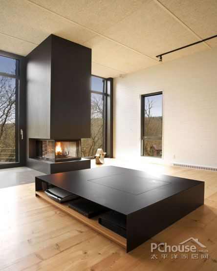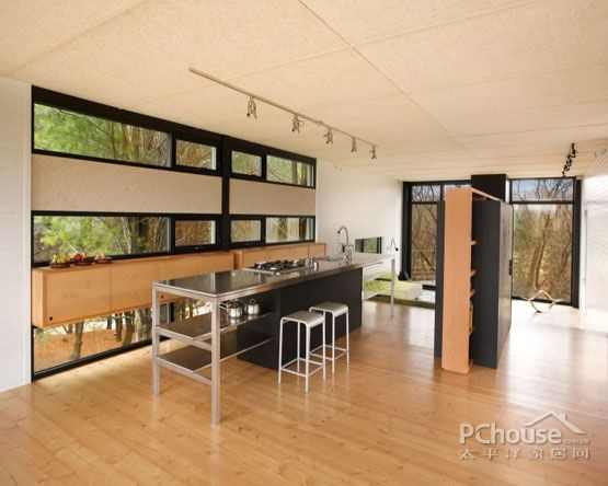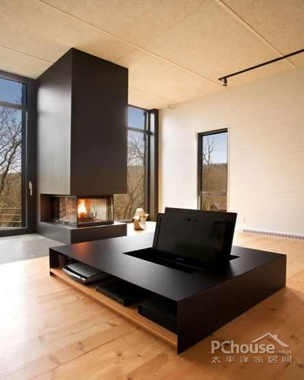 室内使用木料,如油漆过的或天然的厚木板或嵌板,家具全是定制的,绝对是独一无二的设计。从长餐桌到可以隐藏电视机的日常餐桌;从客厅里的弧形大沙发到厨房里德不锈钢台桌;从楼道里的书架到墙上的铝制夜明灯;从墙到墙的双人床到悬挂式双层床。