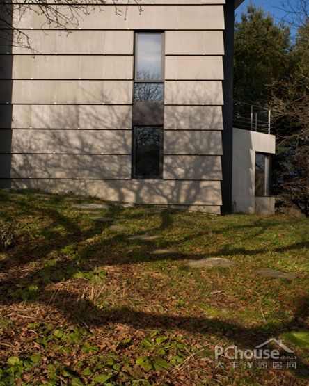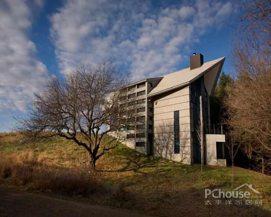 在形态上,不规则的外观酷似农舍。而在材质上,设计师则运用了创新的材料。墙壁和屋顶采用的是未加工的纤维粘结面板。这是一所超越国内规模的特殊房子,它既简约又实用,具有防腐功能,绝对经得起时间的考验。