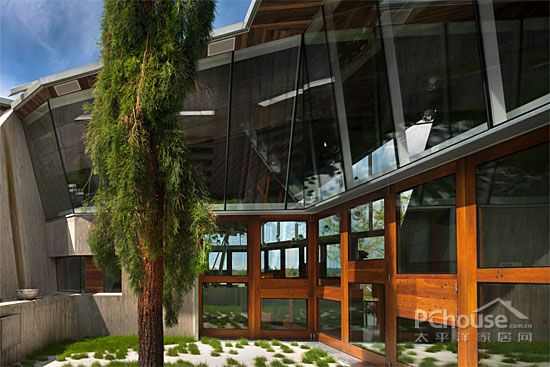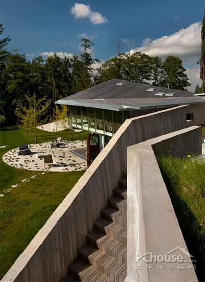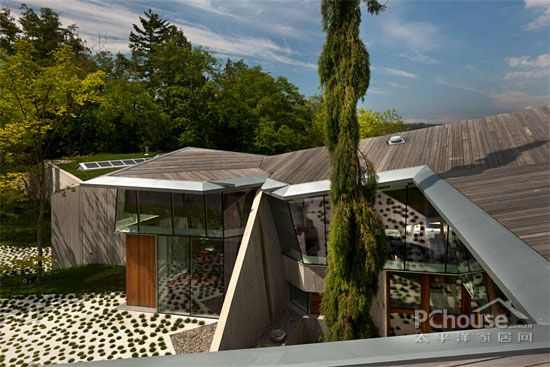 屋梁的长度不同导致了复杂的必要性,因此形成了三角形的几何形状、丰富的内部空间和一个不寻常的屋顶。屋顶担任的是次要景观的角色并在缓坡上创造了一处人造景观。