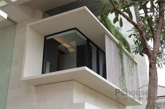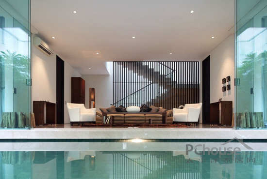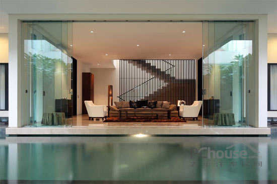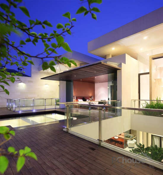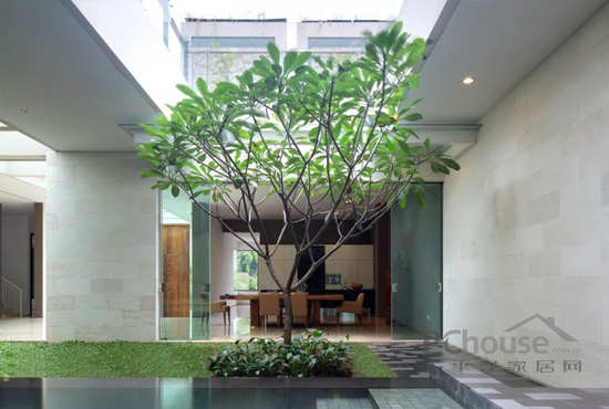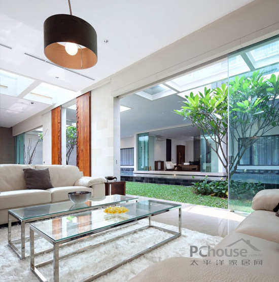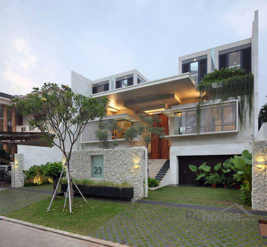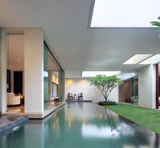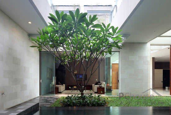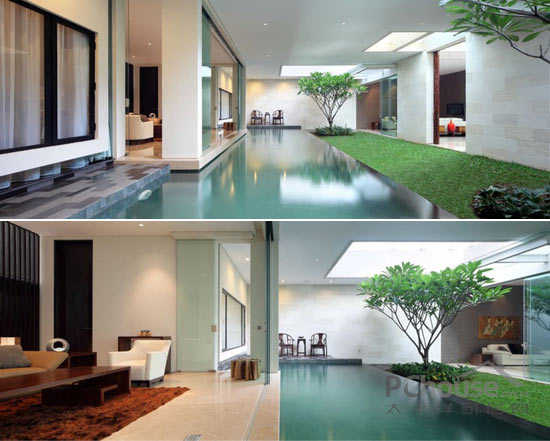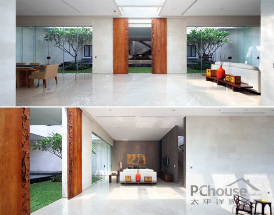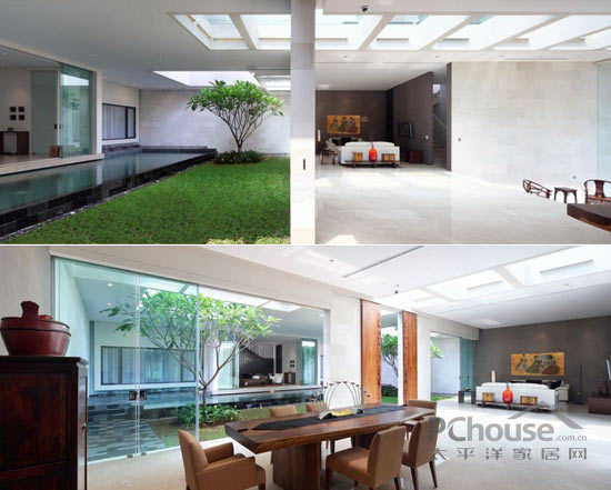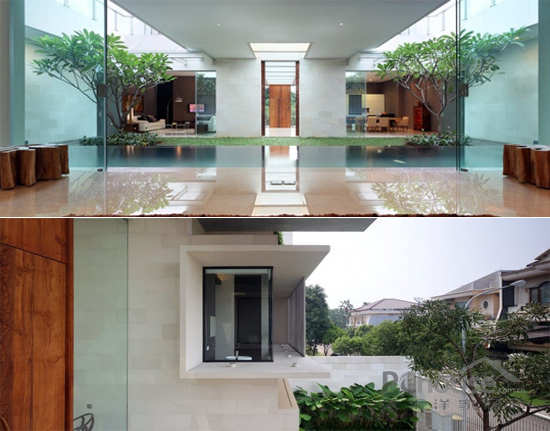 该项目位于印度尼西的亚雅加达,从图片我们可以看到位于房屋中间位置,有一个达到600平方米的空间,使房屋处于半分离状态,这两部分之间没有用任何物质和建筑的分隔。客户要求现代化设计并带有独特的园庭景观的房子,使房屋室内外得到最大限度的连接。出于此要求,这个地方需要很大的空间——必须达到800平方米,而且应该位于有限的地点内。由于此限制,并且比较了大量的项目后,房屋的设计就包括了两个院子的空间。它们经过精心设计并且相互连接,垂直设计还相互利用空间。