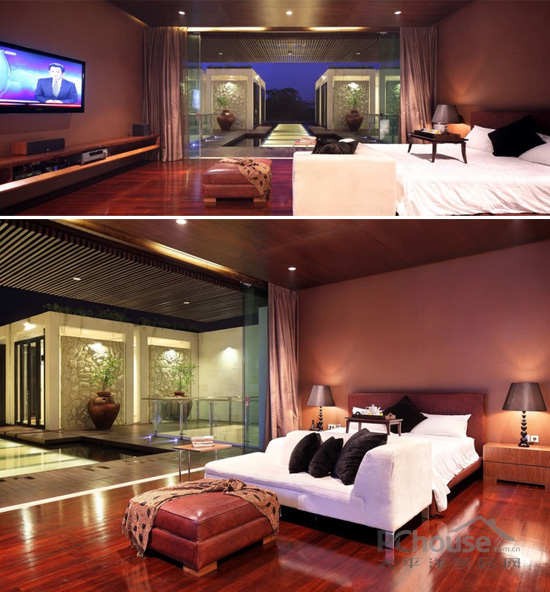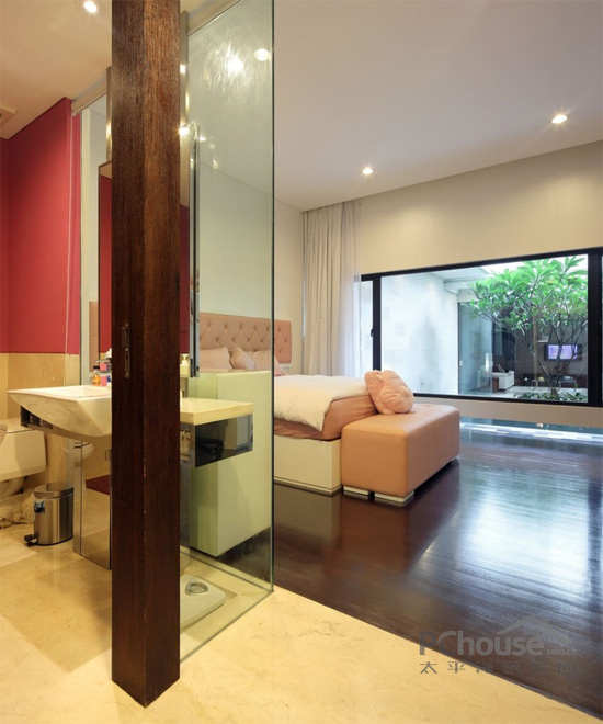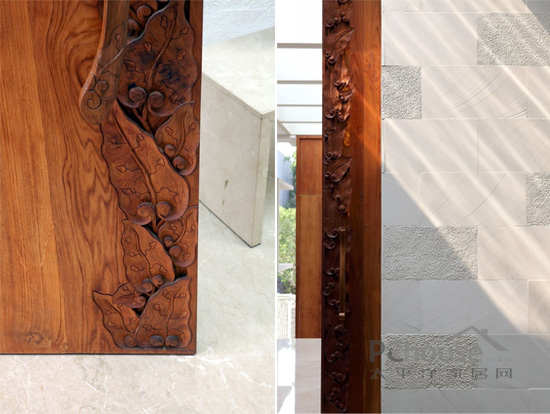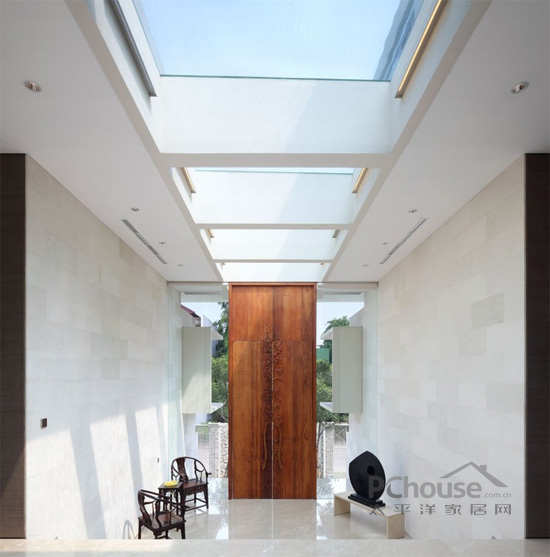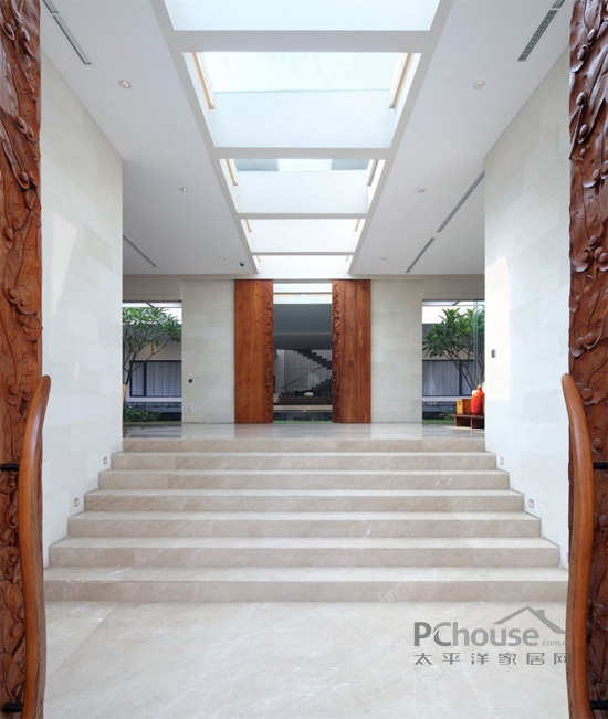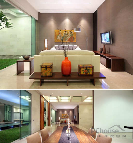 公用客厅和餐厅里大理石的地板上摆放皮质的沙发,还有黄褐色的落地灯和现代化不锈钢的咖啡桌。特别定制的,由Kayun制作的主入口的木门,上面有特别的花纹装饰,衬托室内的庭院。餐桌是用一件天然的的木质厚板,连接摆放在卡其色墙纸前面,装饰用的中国古董式的橱柜。