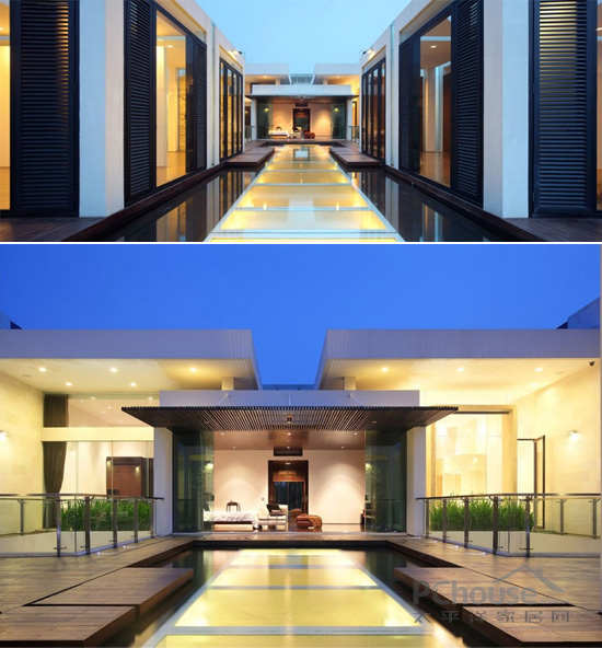 白天里,院子池塘里的水影反射,给楼下的休息室带来一种大自然感。第二个院子也精心设计,通过小孔使下面的房间有阳光进入到。游泳池在一楼的院子里,同时它还是室外空间的反射镜。所用的材料仅是日光和外面车灯。