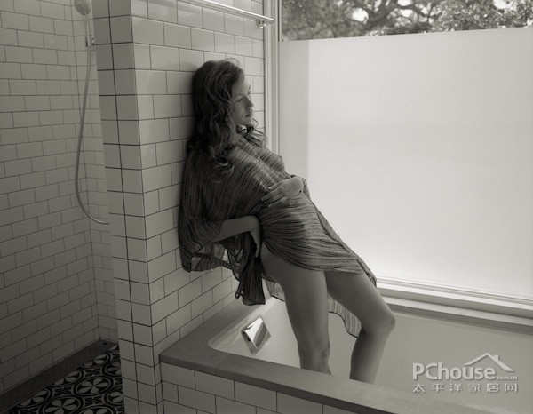 在主浴室,简单的白瓷砖,大朵的像雨花一样的地板瓷砖,以及十几年前的浴缸贴花。另外楼上:是办公区域,那里的墙壁则是一些装饰艺术家的代表作物,包括John Mayer和Ray LaMontagne。