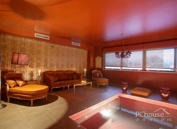 从奢侈的红色内池,可以看到外面的游泳池和阳台。