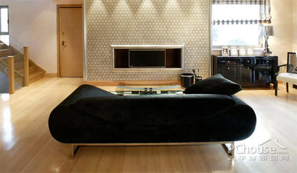 客厅里有一个宏伟的壁炉,为银和金色的金属瓦片所覆盖。其大胆的颜色——黑色,褐色和银色,共同创造了一个舒缓而又优雅的氛围。
