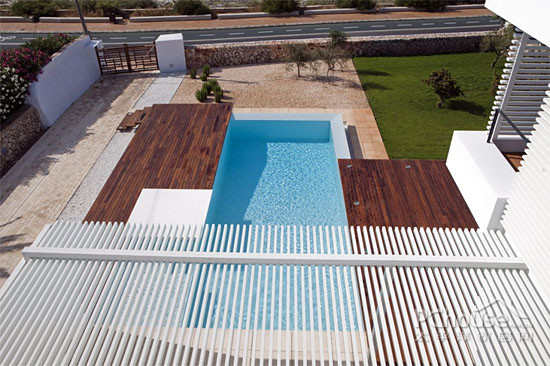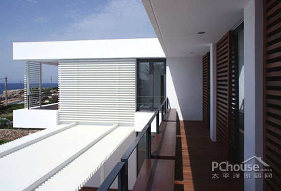 基于一些典型格架“menorquinas”设计了一道滑动木狭板来透出室外,它们就像防晒霜一样,给予了住户必要的隐私,而且更具实用性。