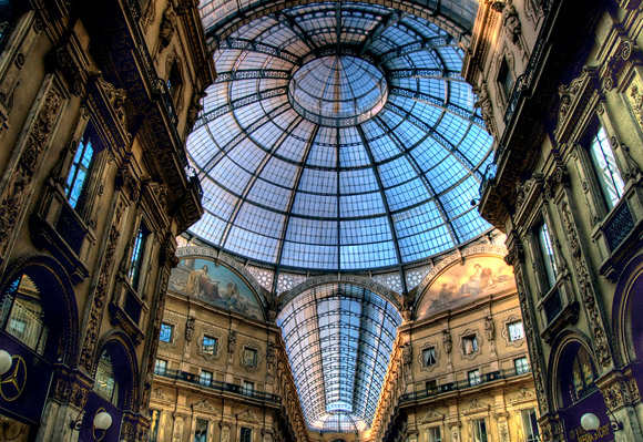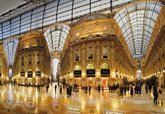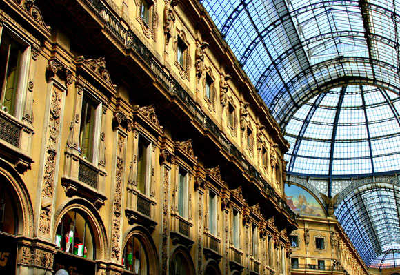 在米兰大教堂广场左侧有维多利奥·埃玛努埃尔二世长廊,建于1865 -1877年长廊呈十字形,长196米,宽47米,高47米廊顶呈拱园形,顶上装有彩色玻璃棚。地面是用大理石铺成的马赛克图案。巨大的拱形建筑富丽堂皇,长廊内有装璜考究的金银首饰、时装、礼品店、餐馆,咖啡厅和书店。这里是米兰市民的休闲中心,到处是休息的市民及观光客,常年很热闹。穿过维多利奥·埃玛努埃尔二世长廊来到的斯卡拉广场(Piazza della Scala )上有列奥尔德·达·芬奇的雕像。