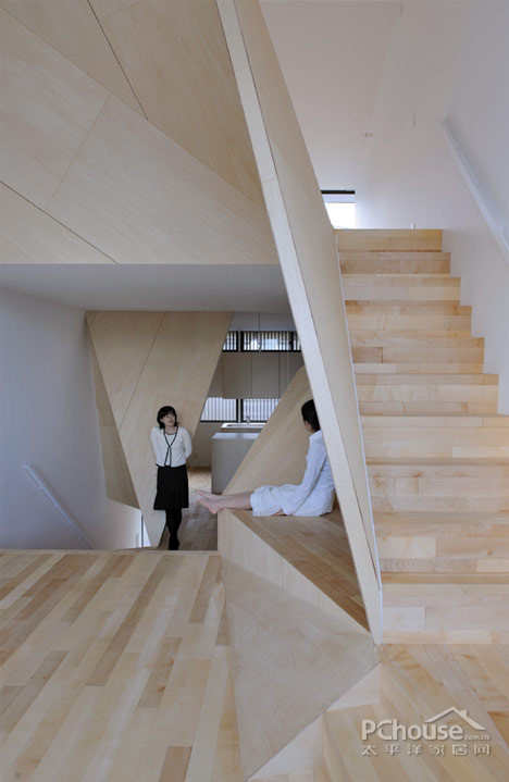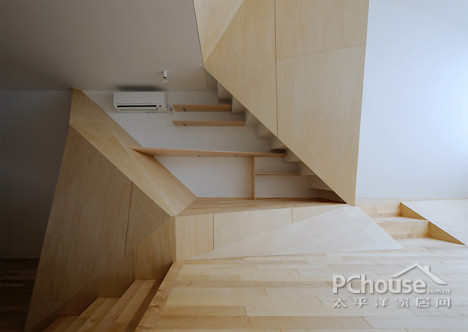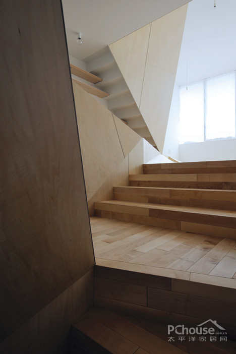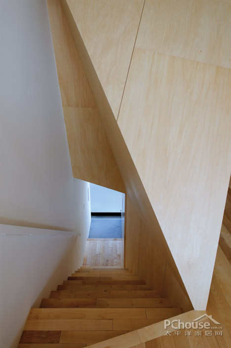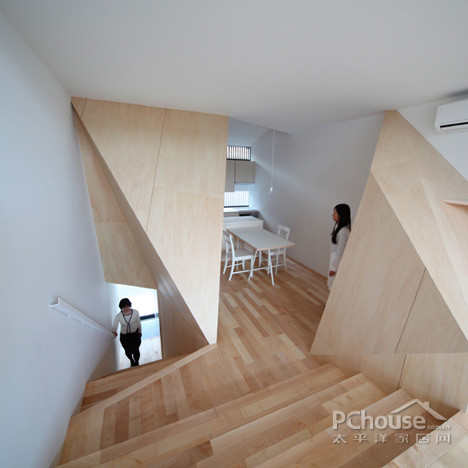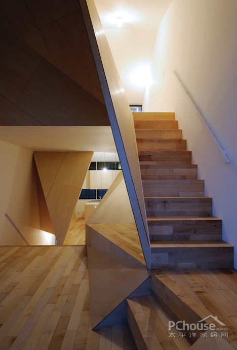 首先,普通的隔断墙通常向垂直方向和水平方向延伸,而当隔断墙是多维的,在视觉上,便能轻松地将房间的三层连接起来。另外,虽然各个空间被连接起来了,但通过这堵隔断墙却又能看出各个空间具有一些动态的细微差别。第二,这堵隔断墙还用作房子内部自然光的反光镜。由于隔断墙具有多角度,它能轻松将北面和南面的光线反射到房子里缺乏光线的地方。第三,这堵和天花板和地板连在一起的夹板墙给人良好的触觉以及视觉享受。最后,隔断墙模糊了家具和建筑风格的界限,因而刺激认知及行为。