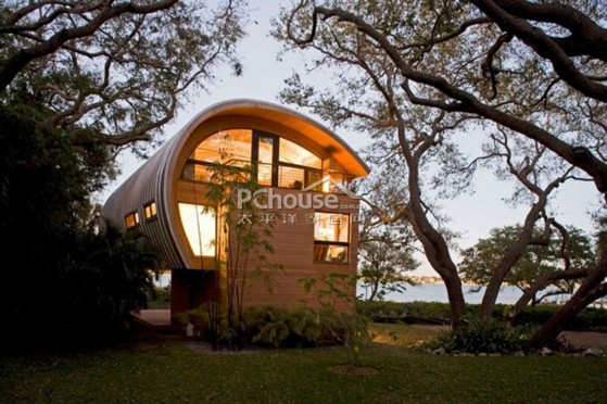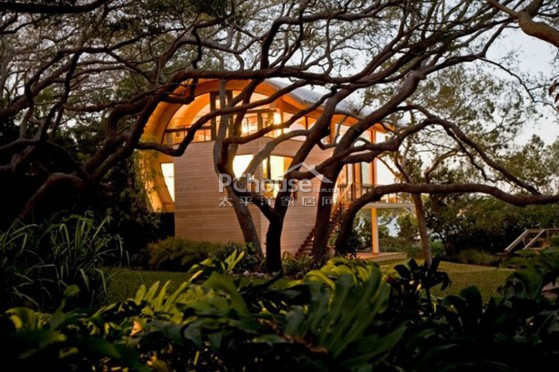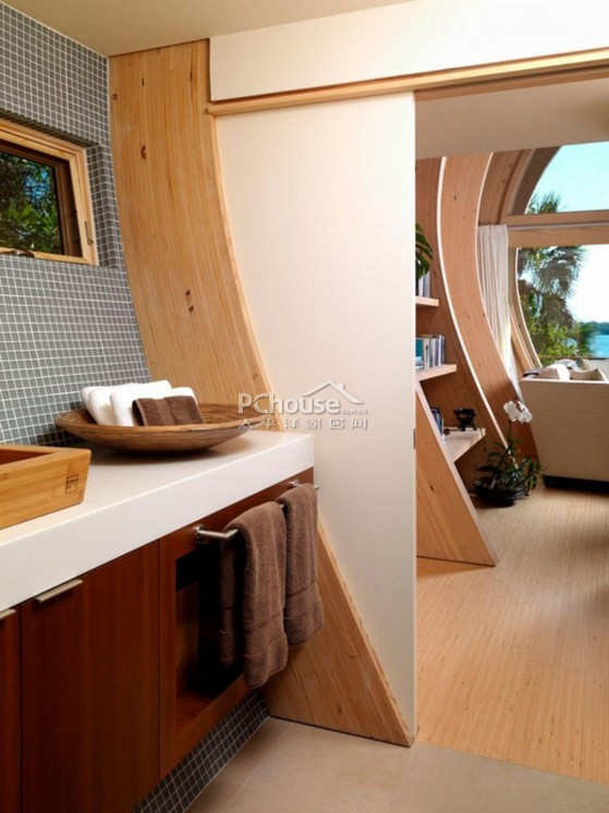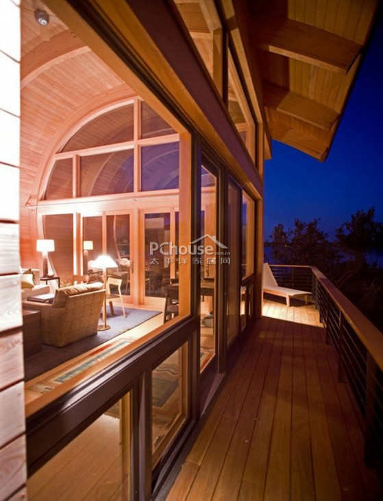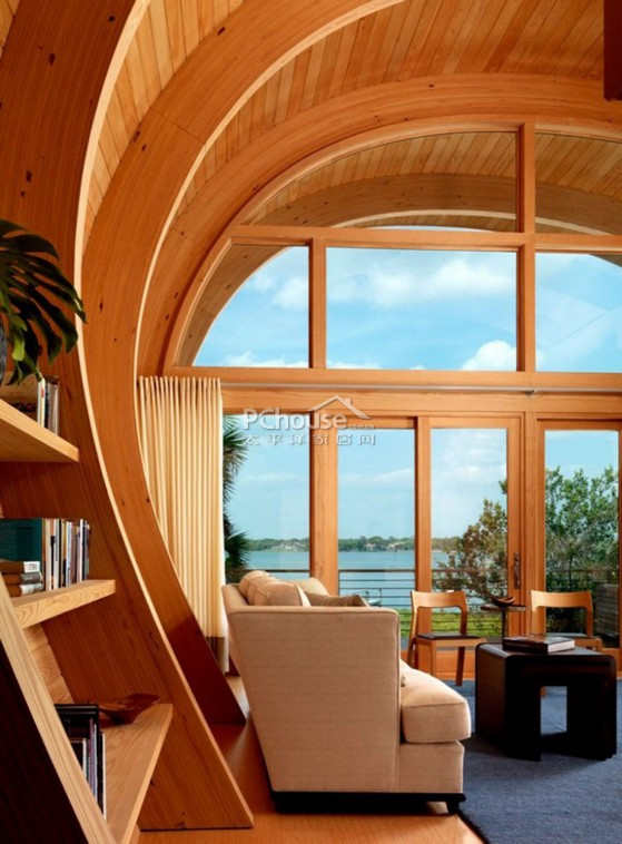 阁楼的内部主要以曲梁架构,隐含着一个水生环境和海湾小木船船体构造。船的柏木互搭板壁覆盖着外层的墙壁和室内弯曲的墙壁。