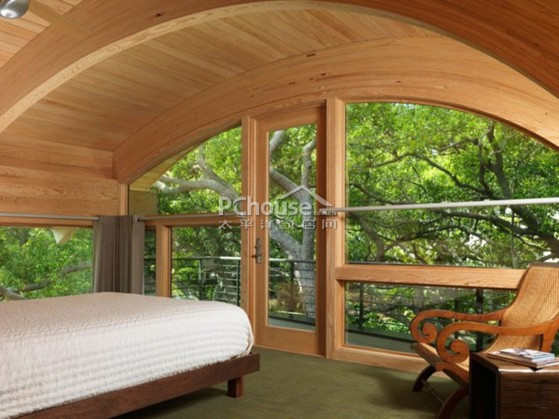 分层的松树横梁在整体空间的上方呈现曲线状,使墙壁和屋顶之间的分别变得模糊。