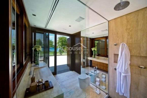 前庭拥有一个大型游泳池,深浅变幻的蓝色清亮而美丽,当你想要放松或者清醒一下头脑的时候,可以在池中尽情游戏。室内设计同外部造型一样采用木材和玻璃的组合,舒适而雅致。以上是这幢别墅的图片,可以一饱你的眼福。