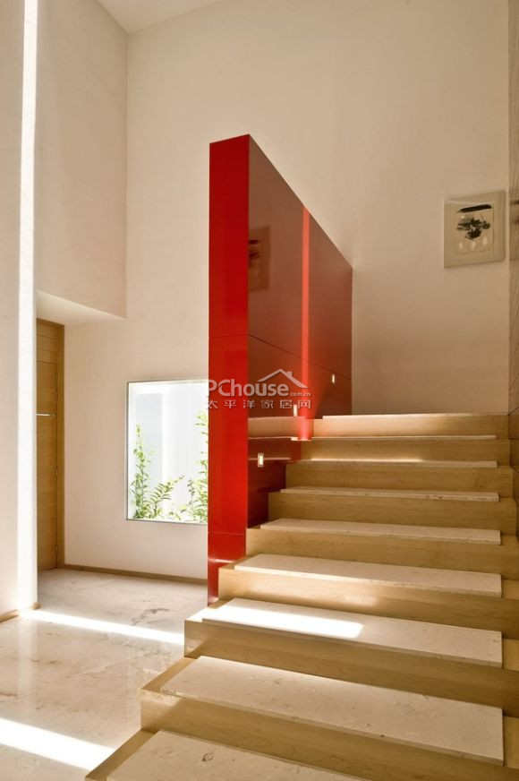 设计师在室内还采用了两种独特而有趣的设计:楼梯由大理石和木材重叠砌成,一侧是提升整体色调的红墙,在日光之中异常明丽;在通向主卧和两间客卧的楼梯上可以看到花园中的绿树红花。