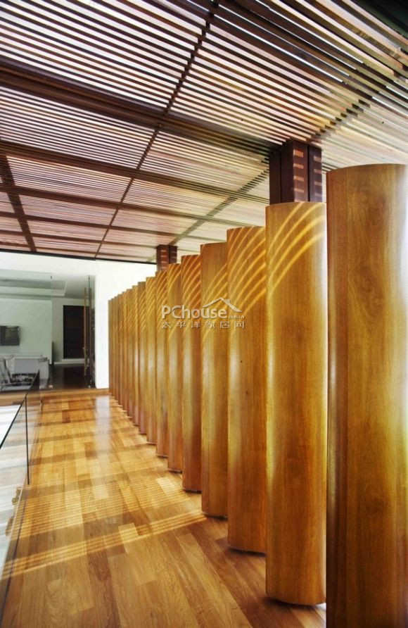 外围的天然水池和栽植着绿色的人工水池将别墅衬托出别样的柔和之美。木制的柱子和遮盖连接了内外空间,架构起双层别墅,荫蔽着露天楼梯和水池庭院,湖蓝色的水池中央还有一座梦幻般的池中亭台。