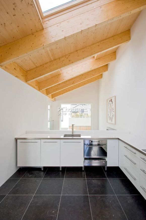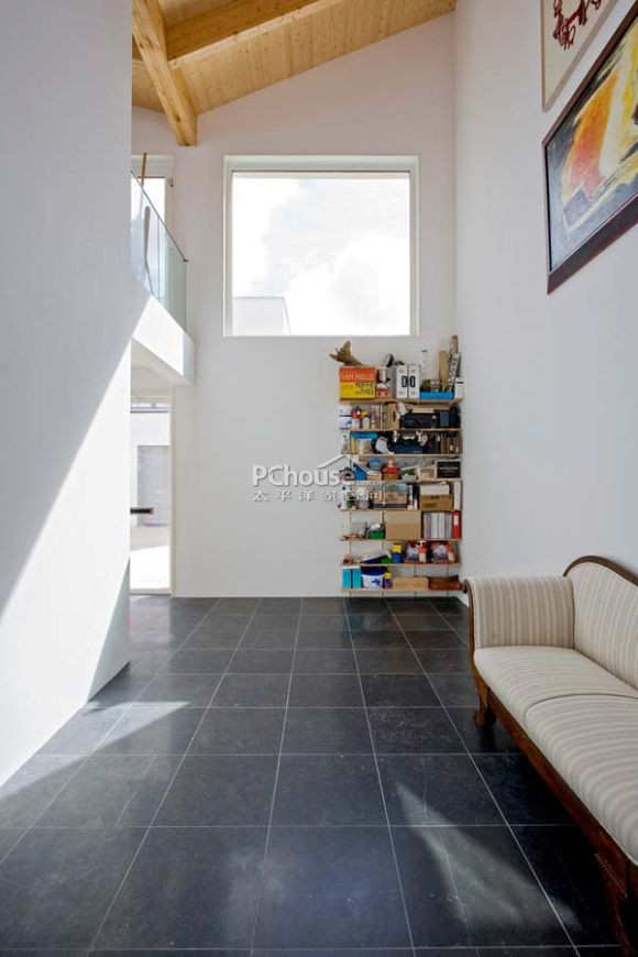 这座房屋一体全白,除开黑框门窗和被设计为黑色浅弧状不对称“V”形的顶部——单独看来颇显单调但与相邻两幢一全黑一碎石风格的建筑搭配起来则恰恰互相调和搭配。