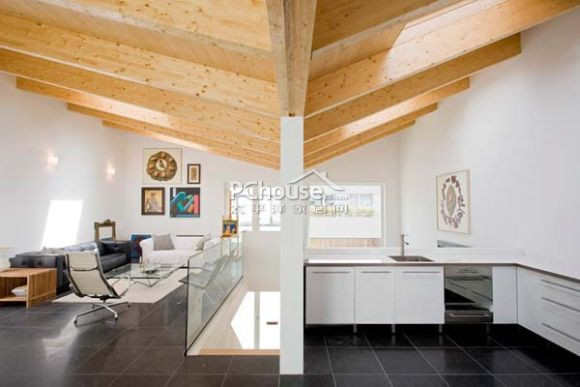 底层为休息室和带浴卧室,“L”形的二层才是厨房餐厅和起居室。