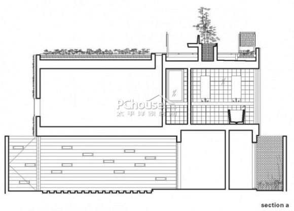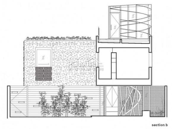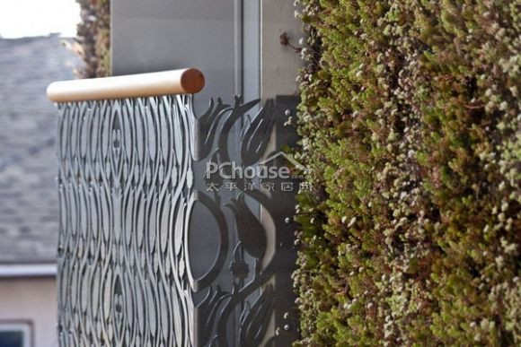 庭院上方悬空建筑外表饰以满墙内植草木,特别设计有一个内置滑拉门式雕花围栏小观景台。