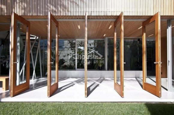 在地面层,开放式的透明玻璃门窗模糊了室内和庭院的界限。