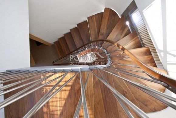 粗细不一的白色圆柱以弧形或直线优雅地交错,搭配深色厚木,构成通往高层的螺旋楼梯。