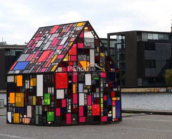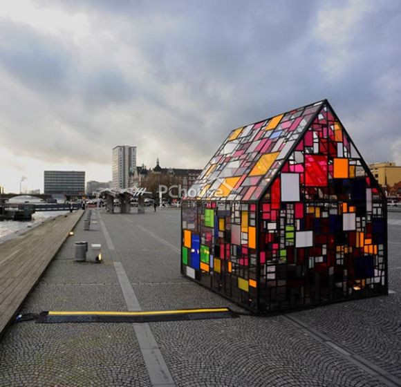 纽约艺术家Tom Fruin在哥本哈根丹麦皇家图书广场上竖立起一间别致可爱的单层彩绘方格玻璃小屋,作为哥本哈根艺术中心日常对外展出的场景之一(Anika Barkan 和 Helene Kvint)。