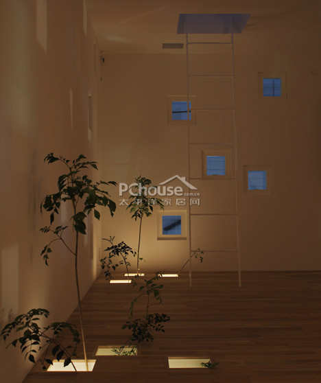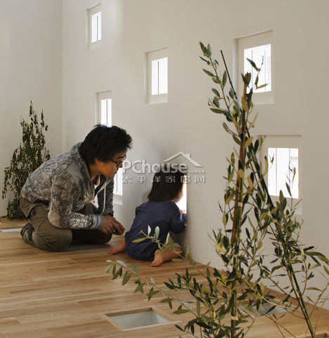 【太平洋家居网 设计频道】 近百个方形小窗散落在这座东京地区别墅的墙壁、天花板和屋顶上,这些小窗使得居住者——一对聋哑夫妇和他们的子女,可以通过墙壁互相打招呼,当孩子们在户外玩耍时招呼起来也很方便。