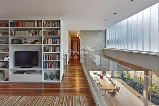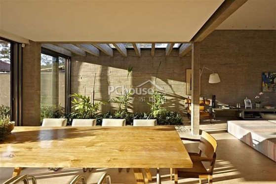 这幢建筑造型非常特别,半扇形的庭院,两侧修有高墙,偏窄的内侧高墙上架有一座封闭式建筑体——即为起居和生活区域,其下的半露天空间即为客厅餐厅区域。敞朗开阔的设计也充分体现出巴西人热情开朗的天性。