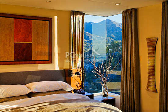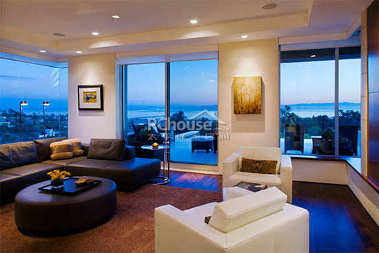客厅的大落地窗户设计使居住者可以观赏圣伊内斯山的美景,黄色的灯光为室内营造了温暖的效果,显现了南加州人民热情奔放,热爱阳光的性格。