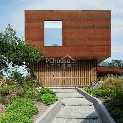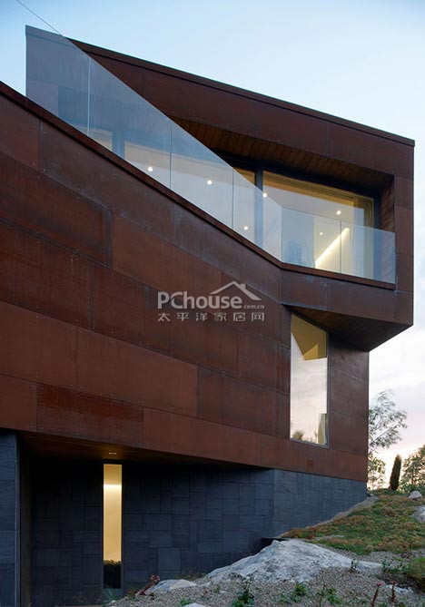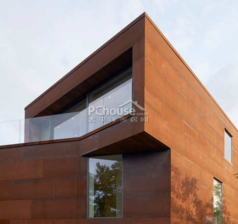 板岩外饰包裹着最下面的楼层,而柯尔顿--耐腐蚀钢的一种,覆盖着上面两层的外立面。