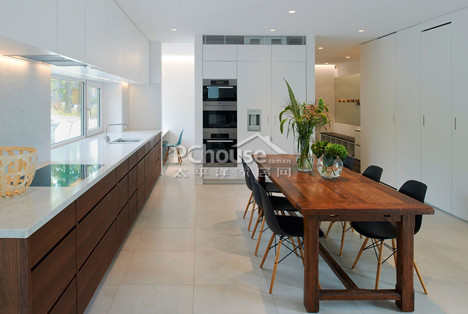 厨房餐厅共用一个空间,采用开放式的设计。简单大方的设计,同时又兼具极好的收纳功能。