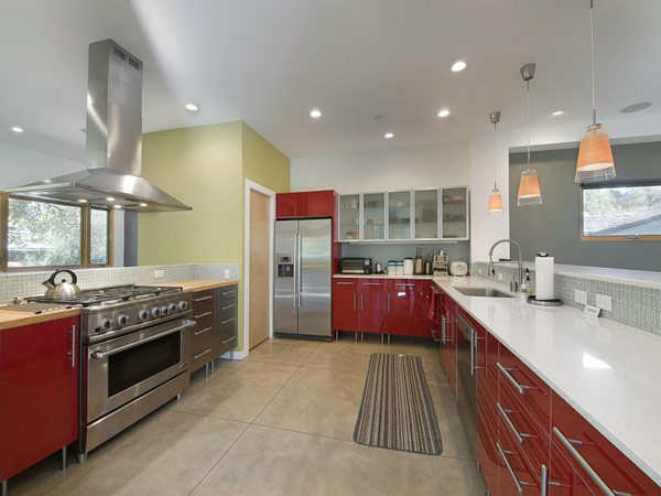 厨房采用鲜艳的红色,为烹调过程增添乐趣,宽敞的空间也为居住者施展手艺提供了条件。