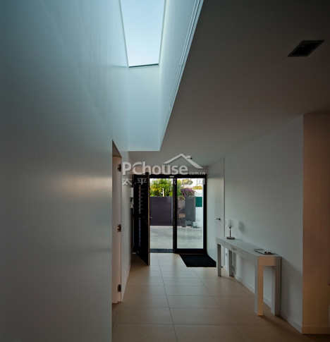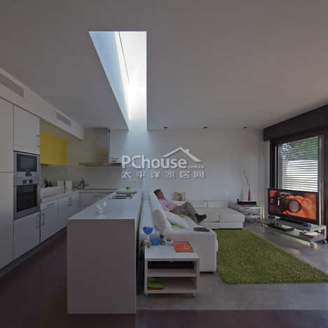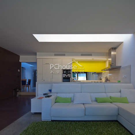 长矩形天窗为走廊和厨房增加了自然采光条件,再者,玻璃门打开了客厅至后方花园和天井的路。