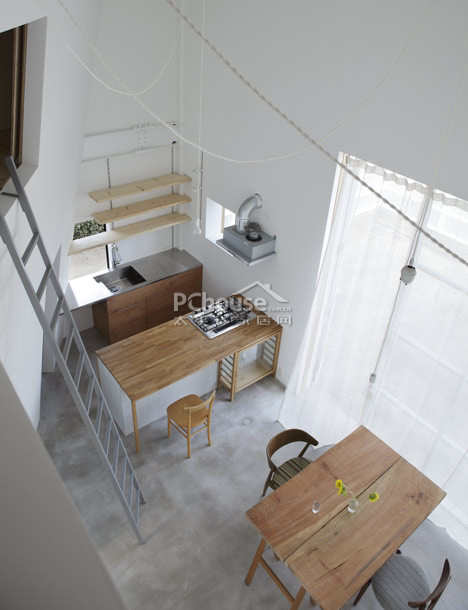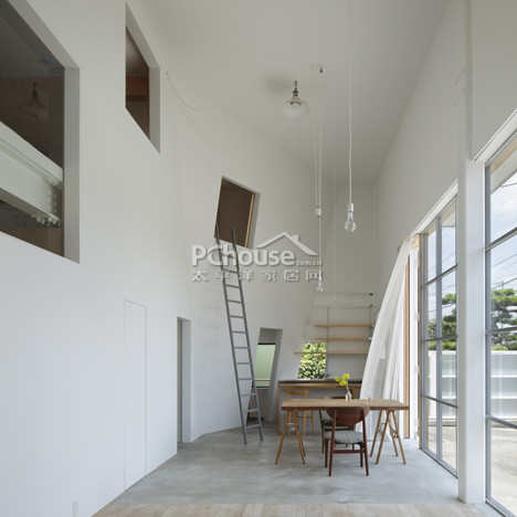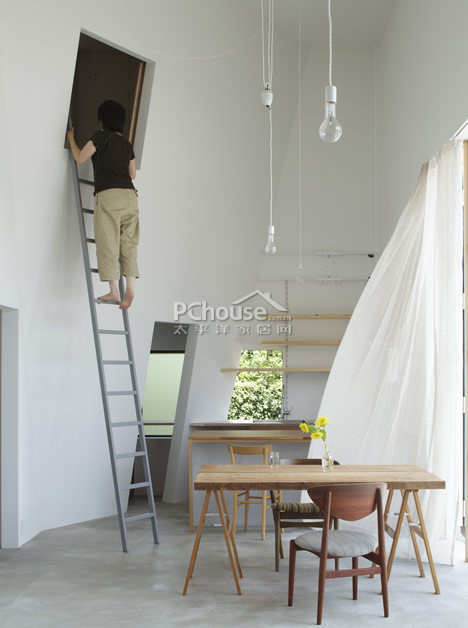 房子传承了日本的一贯风格------以白色为主调,轻木为主要建材,之外,还为爱好运动的夫妇巧妙地融入了一条从二楼主卧通往一楼的斜梯。