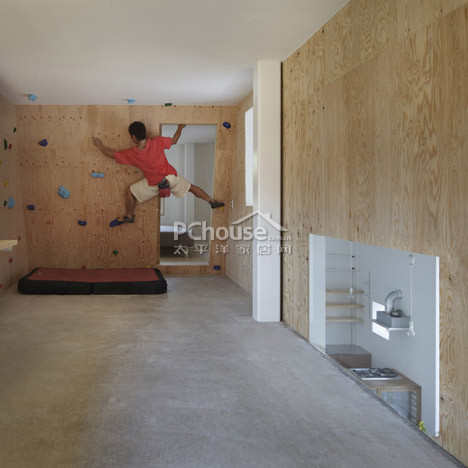 这座房子是专为一对喜爱在闲暇时间攀岩的夫妇设计的。两层高的房子在一楼有着一面倾斜的木制墙,这是为了在室内攀岩墙做准备。