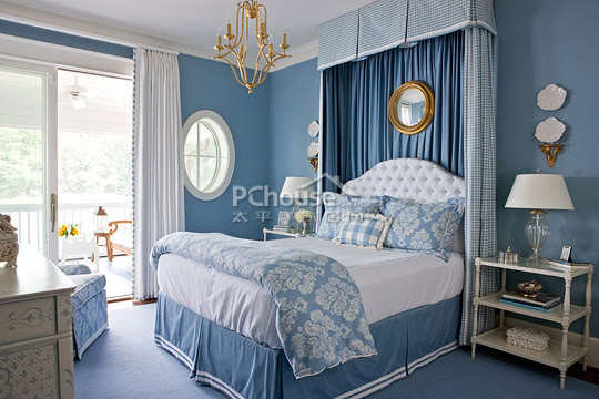 客房悬挂着一盏雅致的黄铜吊灯,检验过的罩蓬增加了床头的高度。枕头和羽绒被被绣上精美的蓝白图案。墙壁淡蓝色的布置,令人心境平和。