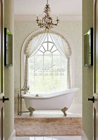 卧房的清雅淡绿逐渐延续到主人家的浴室,白与绿的交融轻轻地布满了整个拱圆的窗户。