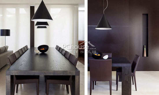 值得一提的是餐桌上的特色圆锥形吊灯,为了整体和谐,设计师特意选用灰色,规则的灯罩配上不规则的吊线,着实是绝佳的艺术家居饰品。