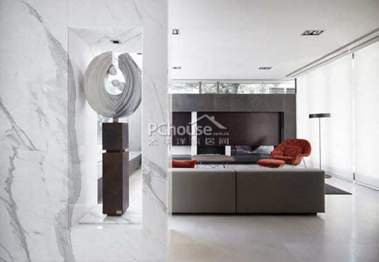 偏厅最大的特点是安装了大型落地玻璃,随着视线延伸,我们可以看见悠悠的绿意,高档的大理石配以特色的艺术品,让空间质感得到升华。