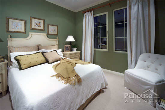 卧室的墙面采用了香草绿为底,为了达到色彩的和谐,床品、沙发、窗帘都尽量简单,按照床架的曲线选择了三幅装饰画,卧室整体感觉较和谐简单。